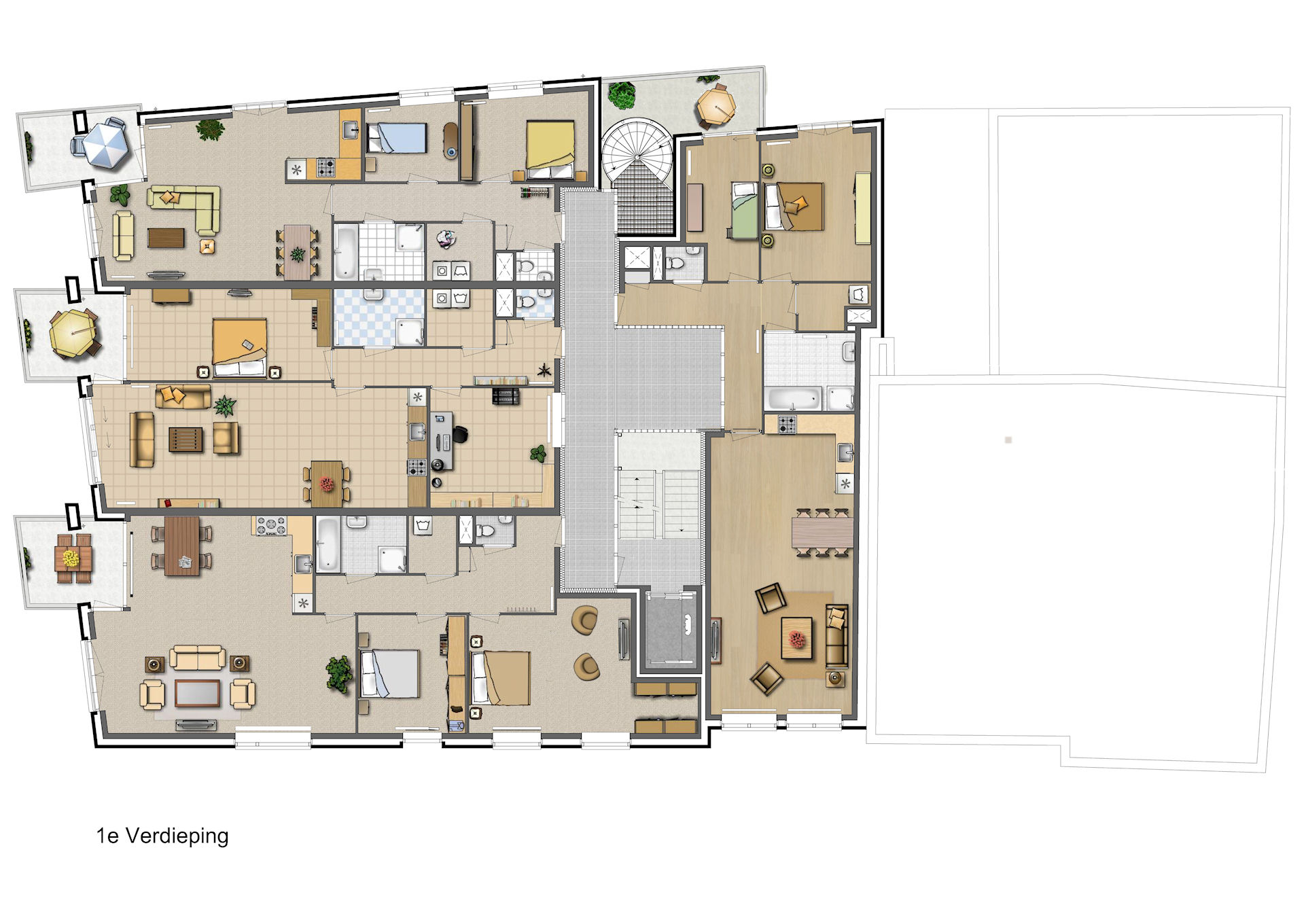 ingekleurde sfeer plattegrond – woningen 1ste verdieping gebouw De Raad in Urecht